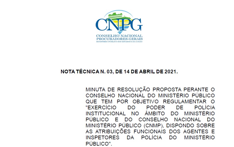 Brasília, 14 de abril de 2021 MINUTA DE RESOLUÇÃO PROPOSTA PERANTE OCONSELHO NACIONAL DO MINISTÉRIO PÚBLICOQUE TEM POR OBJETIVO REGULAMENTAR O“EXERCÍCIO DO PODER DE POLÍCIAINSTITUCIONAL NO ÂMBITO DO MINISTÉRIOPÚBLICO E DO CONSELHO NACIONAL DOMINISTÉRIO PÚBLICO (CNMP), DISPONDO SOBREAS ATRIBUIÇÕES FUNCIONAIS DOS AGENTES EINSPETORES DA POLÍCIA DO MINISTÉRIOPÚBLICO”. https://lsensino.com.br/noticia/mpu-criacao-da-policia-do-mp-sera-protocolada-no-dia-12