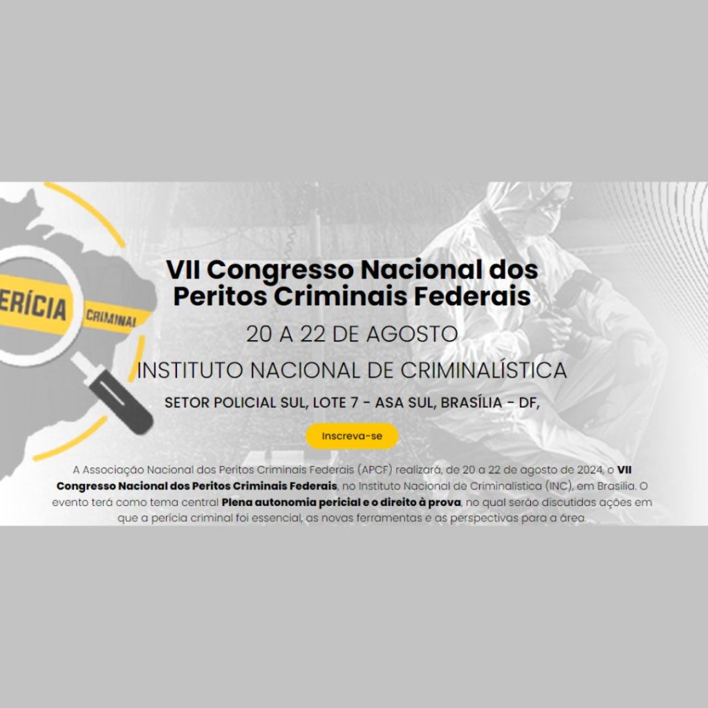 Brasília, 26 de julho de 2024. A Associação Nacional dos Peritos Criminais Federais (APCF) realizará, de 20 a 22 de agosto de 2024, o VII Congresso Nacional dos Peritos Criminais Federais, no Instituto Nacional de Criminalística (INC), em Brasília. O evento terá como tema central Plena autonomia pericial e o direito à prova, no qual […]