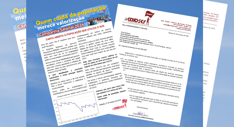 Brasíia, 25 de março de 2026 Ebserh respondeu à cobrança sobre as cláusulas econômicas do ACT 2026/2027, na tarde dessa sexta, 20, afirmando que a Sest não disponibilizou “as diretrizes econômicas necessárias”. Em resposta, Condsef/Fenadsef enviou ofício à empresa. Confira Na tarde desta sexta-feira, 20, a direção da Ebserh informou, em resposta à