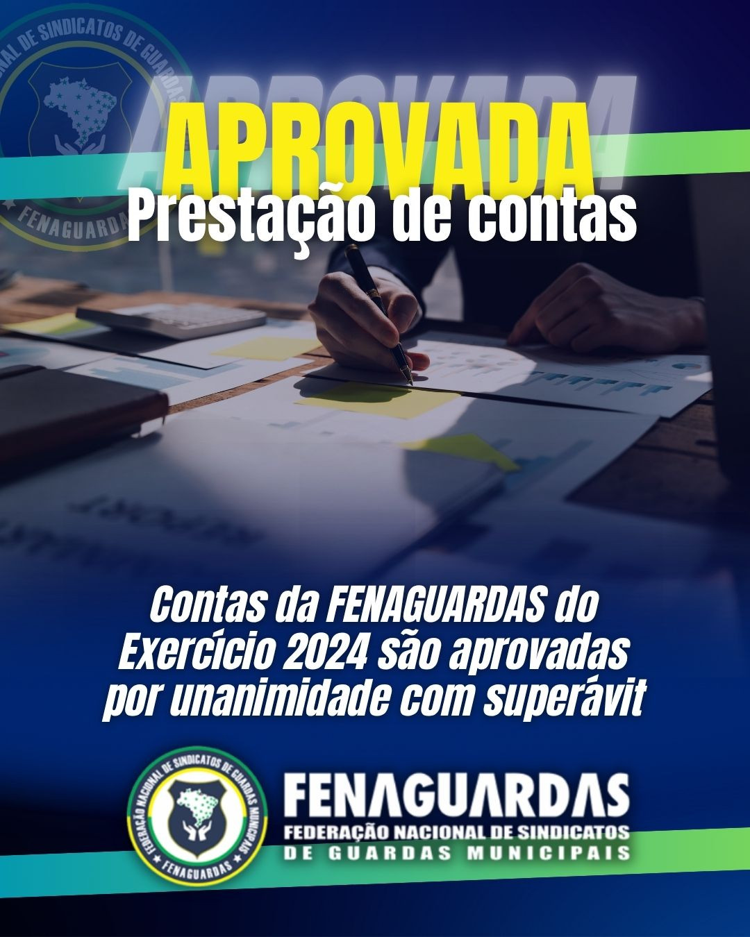 A diretoria da FENAGUARDAS tem a satisfação de informar que, as contas referentes ao exercício fiscal de 2024 foram aprovadas por unanimidade, em Assembleia, com a apresentação de superávit financeiro ao final do período.