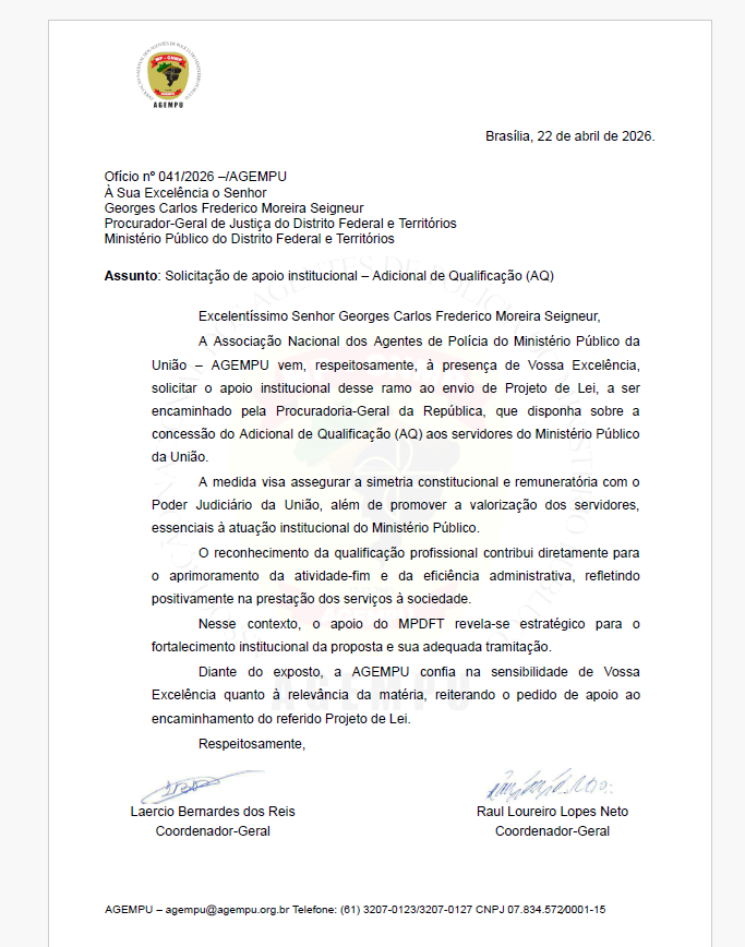 O Coordenador-Geral da AGEMPU Raul Loureiro oficiou aos Procuradores-Gerais dos ramos do MPU solicitando apoio ao envio do PL do AQ.