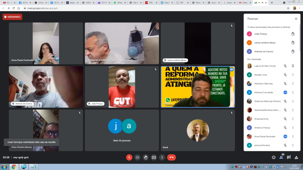 No dia 15 de julho de 2021, o coordenador-geral Laercio Bernardes participou da Assembleia Geral do Sindsep-DF – Sindicato dos Servidores Públicos Federais no Distrito Federal (Sindsep-DF), na modalidade virtual, com base nas atribuições legais conferidas pelo art. 27 do estatuto da entidade, garantida toda segurança sanitária em razão da pandemia da Covid-19.