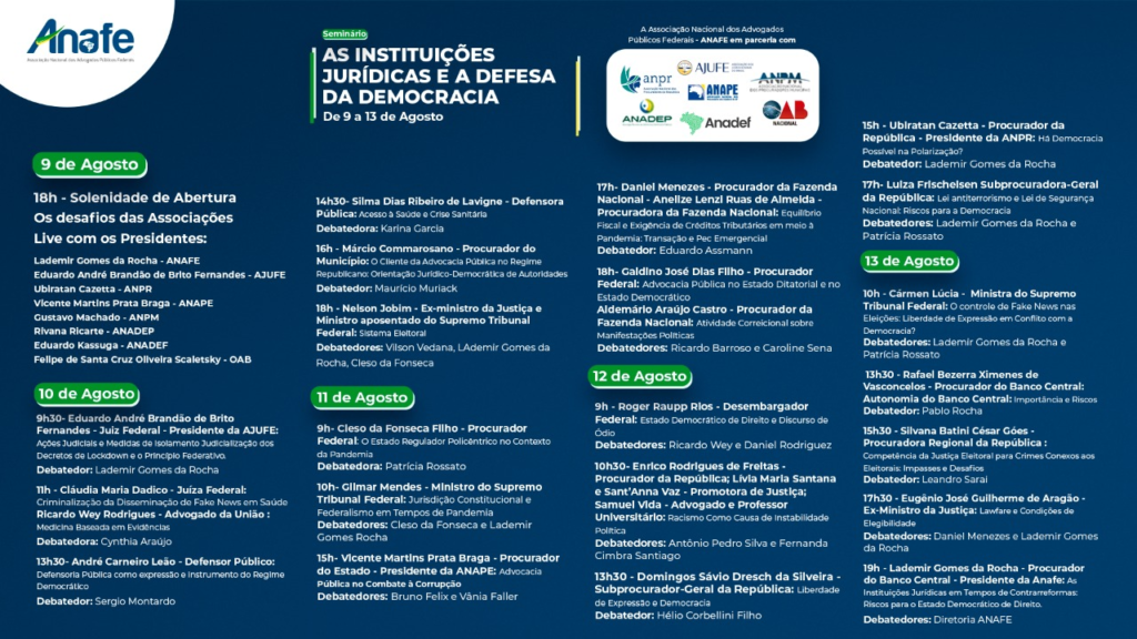 A noite dessa segunda-feira (9) marcou o primeiro dos cinco dias de atividades do seminário “As Instituições Jurídicas e a Defesa da Democracia”, promovido pela ANAFE. Abriram os debates os presidentes da entidade anfitriã, da AJUFE, da ANPR, da ANAPE, da ANPM, da ANADEP, da ANADEF e o representante da OAB, que discutiram sobre os desafios das associações. O evento foi gratuito, e a transmissão ocorreu pelo canal da TV Anafe no YouTube: www.youtube.com/tvanafe.