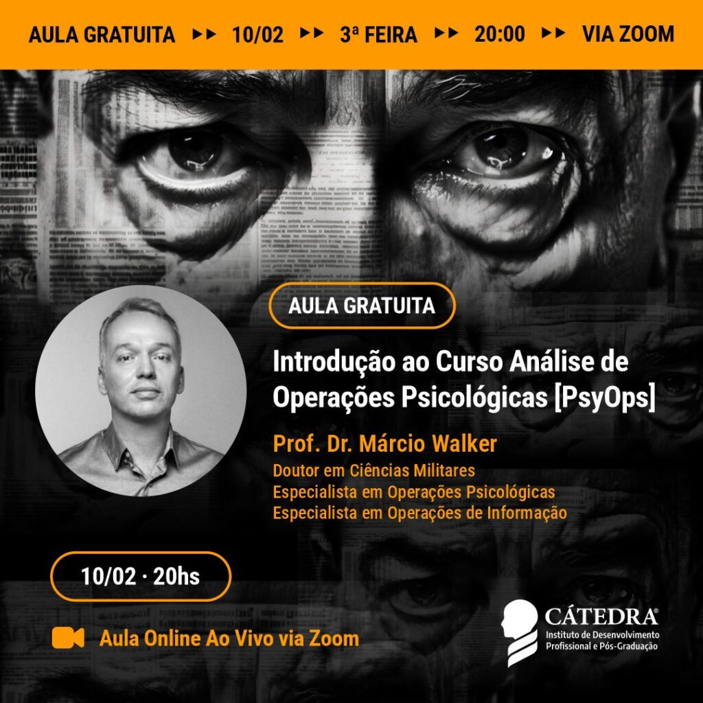 Convidamos você para participar gratuitamente da aula introdutória sobre o curso “Análise de Operações Psicológicas [PsyOps]”, que será realizada amanhã, 10 de fevereiro, às 20h, pela plataforma Zoom.