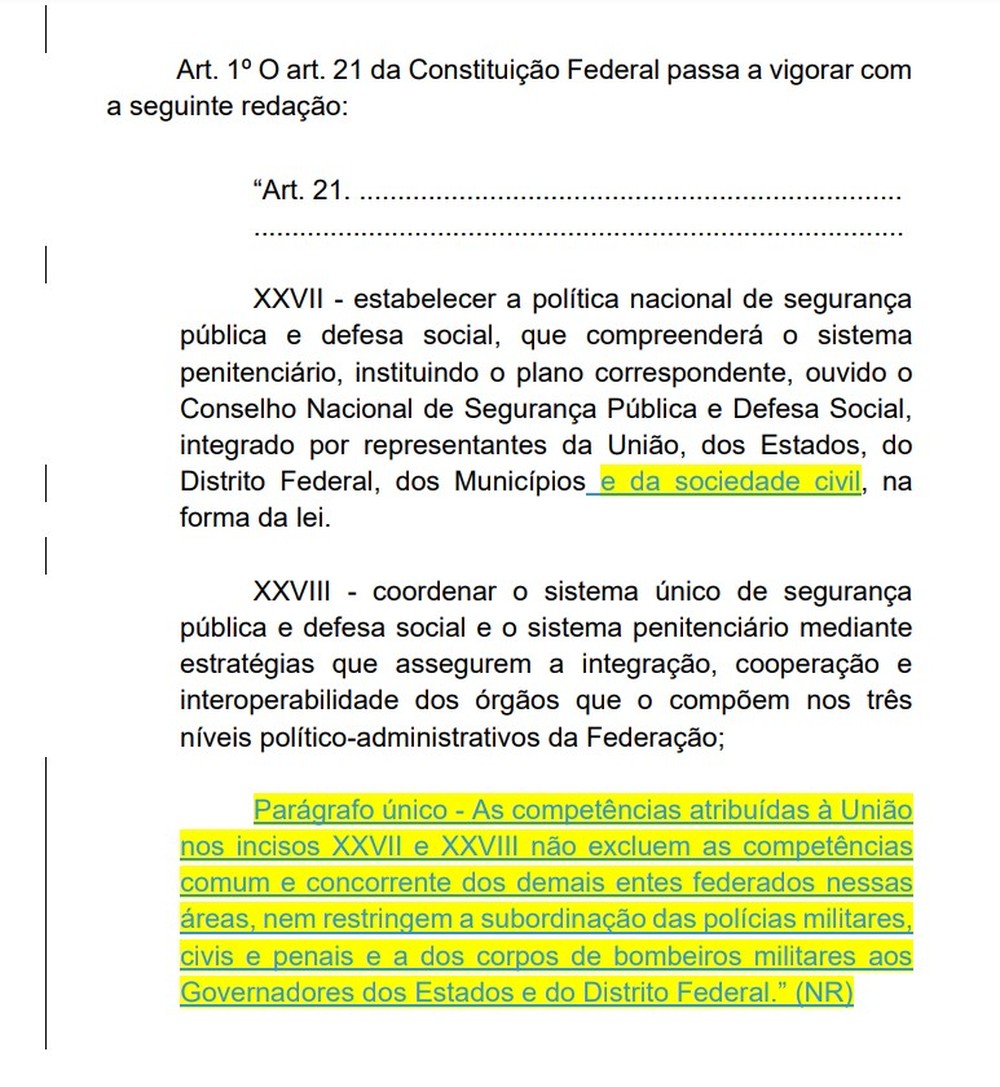 Além disso, foi retirada a expressão “observância obrigatória” do Inciso XXVII do mesmo artigo, reforçando que as polícias militares, civis, penais e os corpos de bombeiros continuam subordinados aos governadores dos estados e do Distrito Federal.