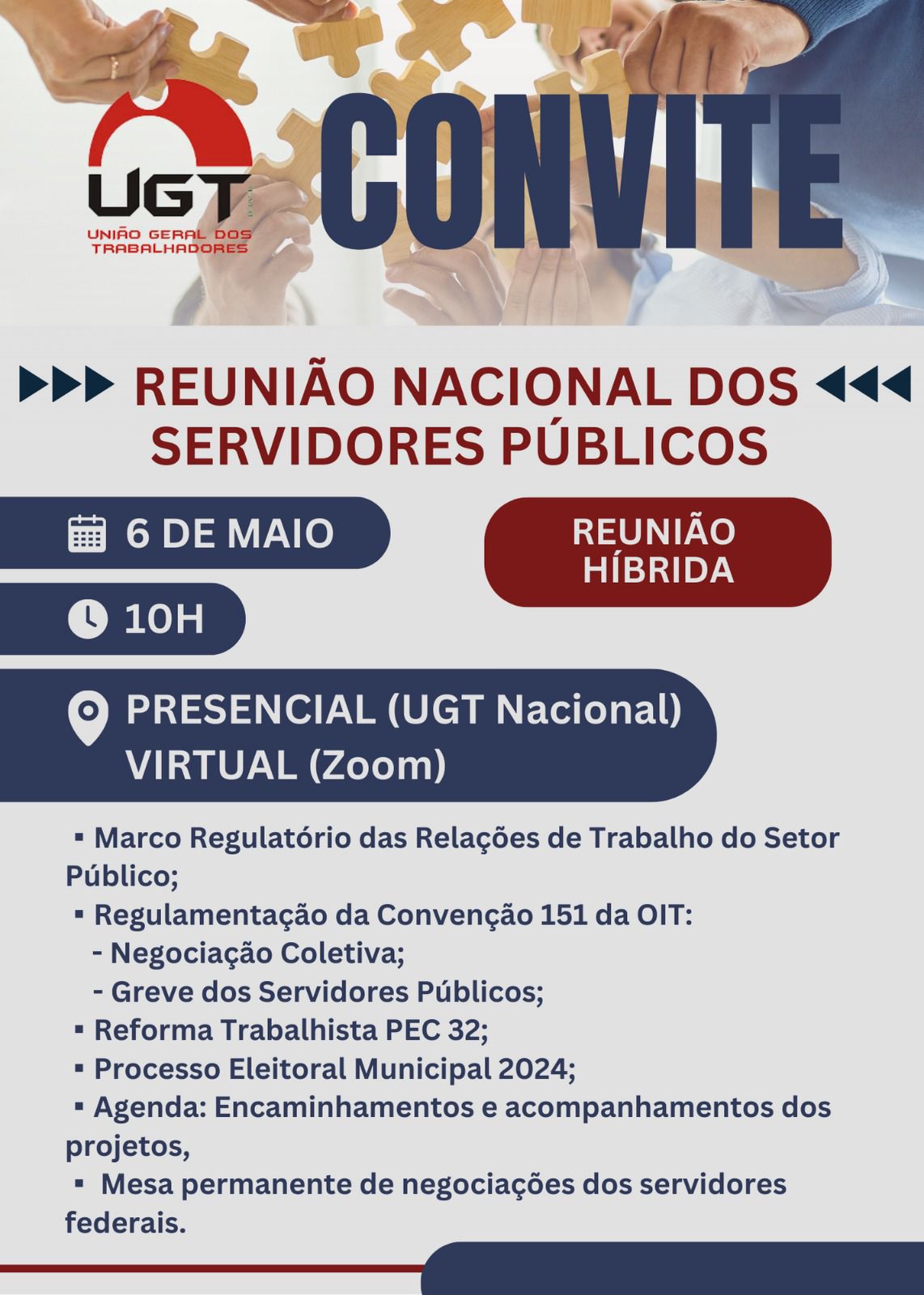 📌 As Secretarias do Servidor Público, e Secretaria de Organização, Formação Político-Sindical por meio dos respectivos secretários Luiz Carlos Silva de Oliveira e Chiquinho Pereira e do 1º Secretário Adjunto de Relações Internacionais Wagner José de Souza convidam todos(as) servidores(as) para participarem da reunião híbrida que será realizada dia 06 de maio às 10h para discutirmos o atual momento que vive os servidores públicos no âmbito, Municipal, Estadual e Federal.