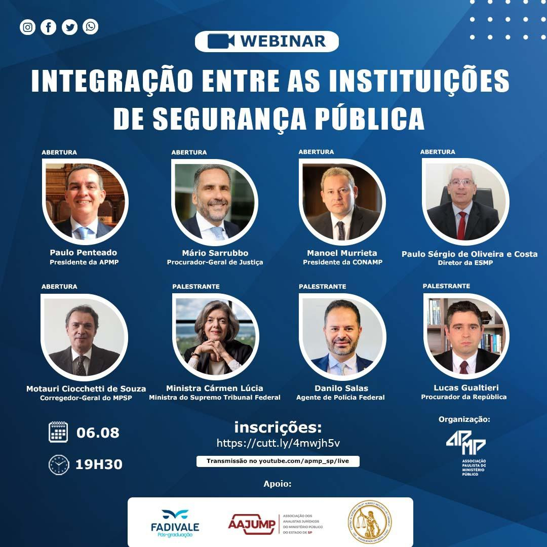 A Associação Paulista do Ministério Público (APMP) promove webinar com o tema “A Integração entre as Instituições de Segurança Pública” no próximo dia 6 de agosto, sexta-feira, às 19h30.