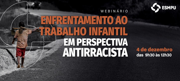 A Escola Superior do Ministério Público da União (ESMPU) promove, em 4 de dezembro, o webinário “Enfrentamento ao trabalho infantil em perspectiva antirracista”. A atividade será transmitida pelo canal da instituição no YouTube e as inscrições ficam abertas até a data do evento. Inscreva-se.